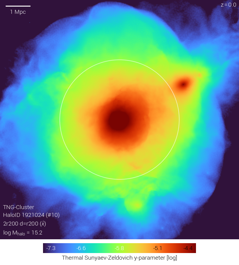 These images from Nelson+ (2023) show the full TNG-Cluster sample of 352 high-mass halos at z=0. Each is shown from three different viewing directions, so if you zoom (out) this page such that three images fit per row, then each row shows three views of the same cluster. The virial radii (R200c) are denoted by white circles, while the field of view extends to two times R200c. Each cluster is shown for a variety of physical properties, here: Sunyaev Zeldovich y-parameter.