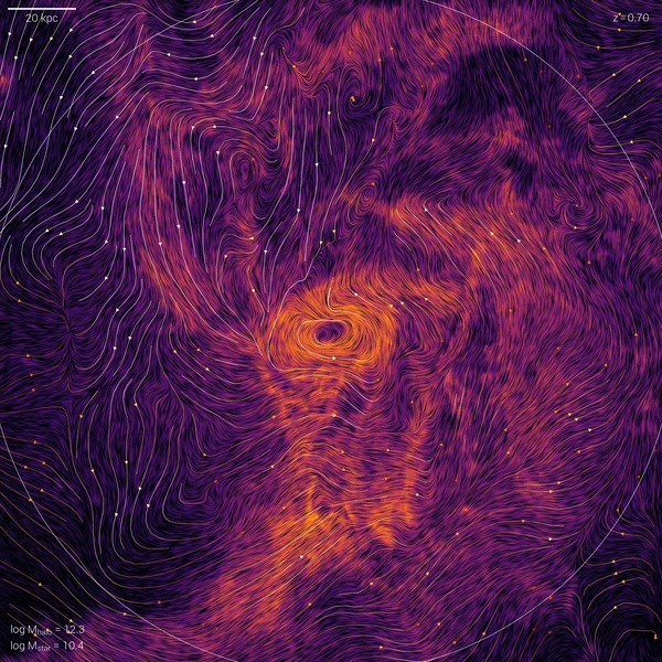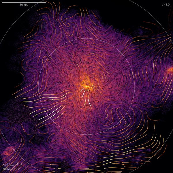 Visualization of the velocity structure of galactic outflows, showing halos between 1011.6 and 1013.5 solar masses at 0.5 < z < 1.0. Here lower mass systems are in the stellar feedback driven regime, while more massive systems also demonstrate strong BH-driven winds. We show individual galaxies, rotated edge-on. The field of view is 200 physical kpc, and the background image shows a gas density projection through an equal depth, modulated by the gas velocity field in a 10 kpc thick slice using the line-integral convolution technique. Color indicates total gas density, while small-scale variation in black shows the local topography of gas motion. The color scales are always the same as in Figure 11 of Nelson+ (2019). Overlaid on top we include streamlines of the same velocity field, to indicate direction and magnitude. Outflows can emerge collimated from the central galaxy, traverse half the virial radius (dotted circle), and establish a large-scale, circulatory, galactic-fountain type flow largely confined within the virial radius of the halo (solid circle).