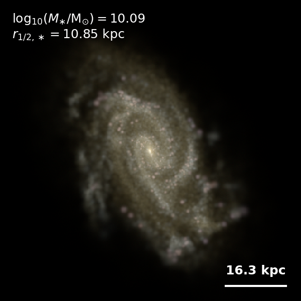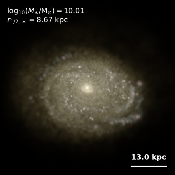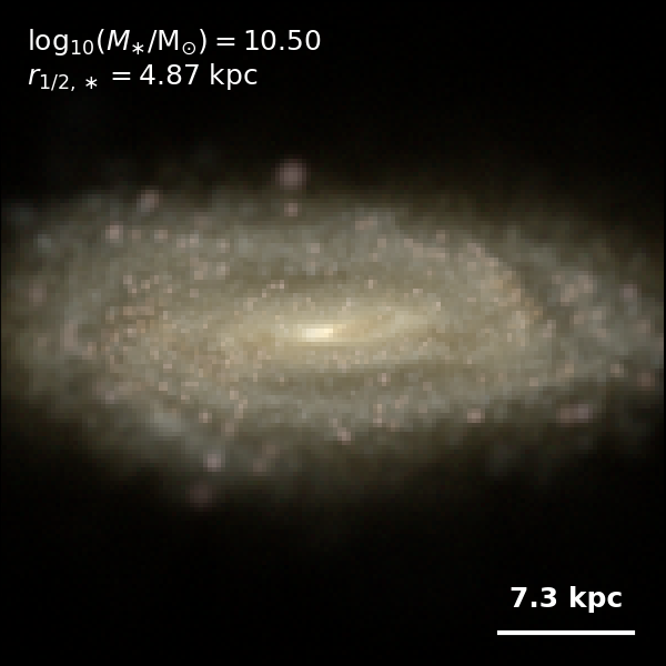 These figures are similar to Figs 3 and 4 from Rodriguez-Gomez+ (2019), but in this case we extend the analysis (originally for TNG100) to the highly detailed TNG50 simulation. Here we show idealized synthetic images (using Pan-STARRS1 g,r,i filters) of randomly selected galaxies from the TNG50 simulation, generated with the SKIRT radiative transfer code. The text labels indicate the total stellar mass and the 3D stellar half-mass radius.