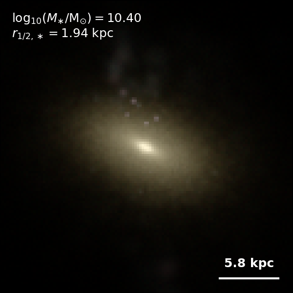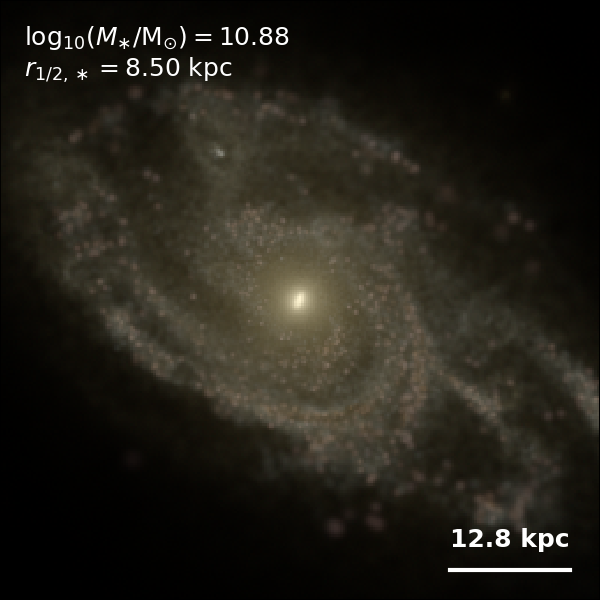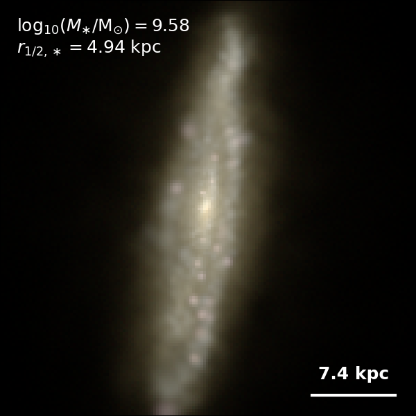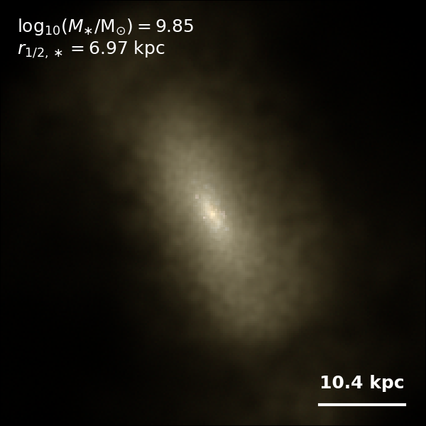 These figures are similar to Figs 3 and 4 from Rodriguez-Gomez+ (2019), but in this case we extend the analysis (originally for TNG100) to the highly detailed TNG50 simulation. Here we show idealized synthetic images (using Pan-STARRS1 g,r,i filters) of randomly selected galaxies from the TNG50 simulation, generated with the SKIRT radiative transfer code. The text labels indicate the total stellar mass and the 3D stellar half-mass radius.
