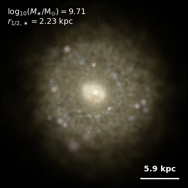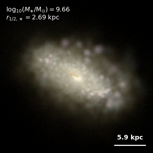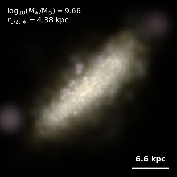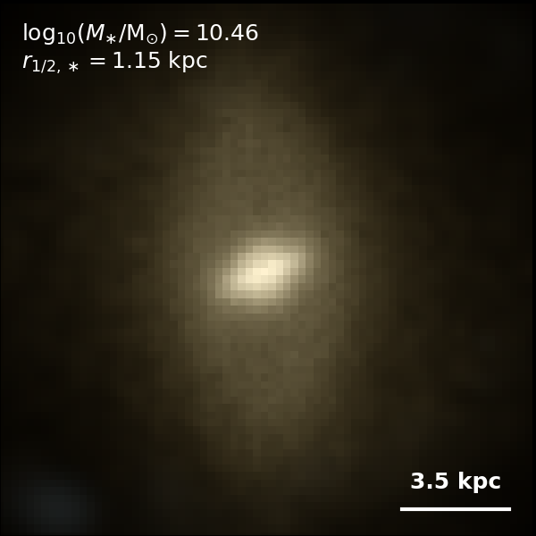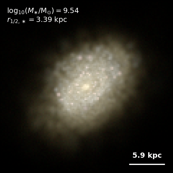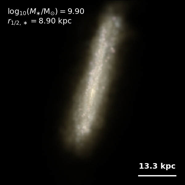 These figures are similar to Figs 3 and 4 from Rodriguez-Gomez+ (2019), but in this case we extend the analysis (originally for TNG100) to the highly detailed TNG50 simulation. Here we show idealized synthetic images (using Pan-STARRS1 g,r,i filters) of randomly selected galaxies from the TNG50 simulation, generated with the SKIRT radiative transfer code. The text labels indicate the total stellar mass and the 3D stellar half-mass radius.