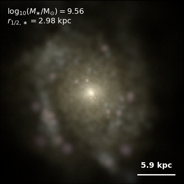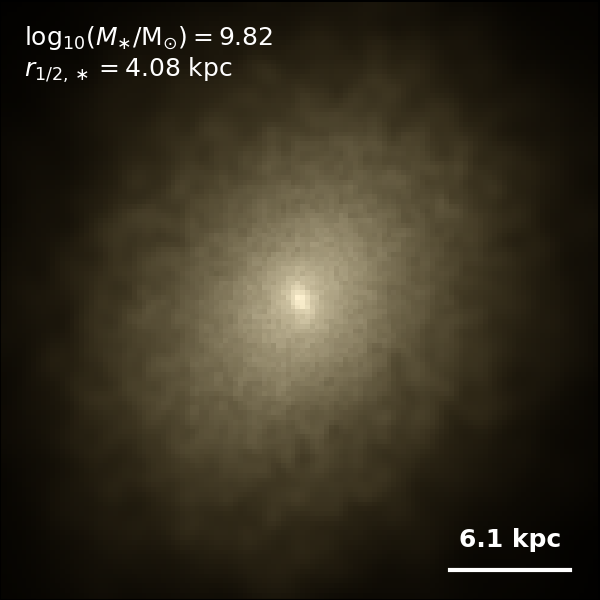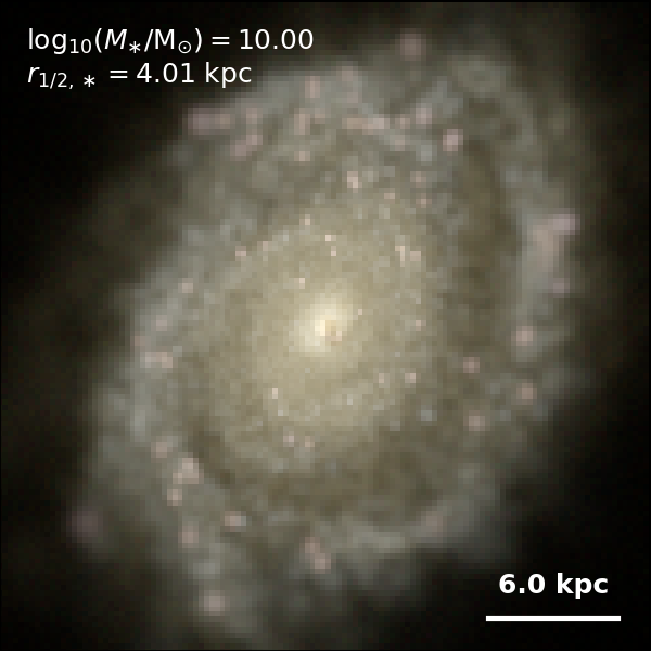These figures are similar to Figs 3 and 4 from Rodriguez-Gomez+ (2019), but in this case we extend the analysis (originally for TNG100) to the highly detailed TNG50 simulation. Here we show idealized synthetic images (using Pan-STARRS1 g,r,i filters) of randomly selected galaxies from the TNG50 simulation, generated with the SKIRT radiative transfer code. The text labels indicate the total stellar mass and the 3D stellar half-mass radius.