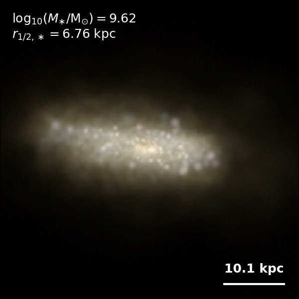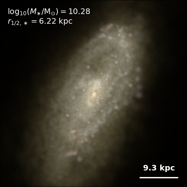 These figures are similar to Figs 3 and 4 from Rodriguez-Gomez+ (2019), but in this case we extend the analysis (originally for TNG100) to the highly detailed TNG50 simulation. Here we show idealized synthetic images (using Pan-STARRS1 g,r,i filters) of randomly selected galaxies from the TNG50 simulation, generated with the SKIRT radiative transfer code. The text labels indicate the total stellar mass and the 3D stellar half-mass radius.