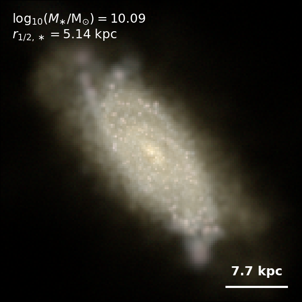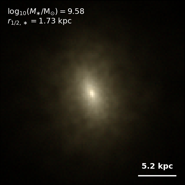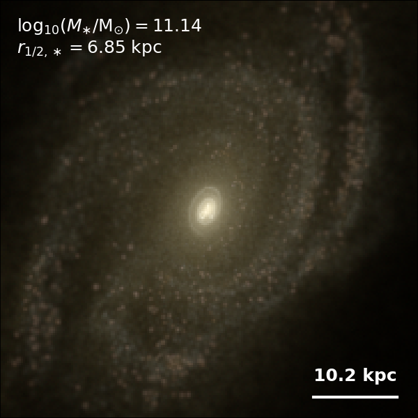 These figures are similar to Figs 3 and 4 from Rodriguez-Gomez+ (2019), but in this case we extend the analysis (originally for TNG100) to the highly detailed TNG50 simulation. Here we show idealized synthetic images (using Pan-STARRS1 g,r,i filters) of randomly selected galaxies from the TNG50 simulation, generated with the SKIRT radiative transfer code. The text labels indicate the total stellar mass and the 3D stellar half-mass radius.
