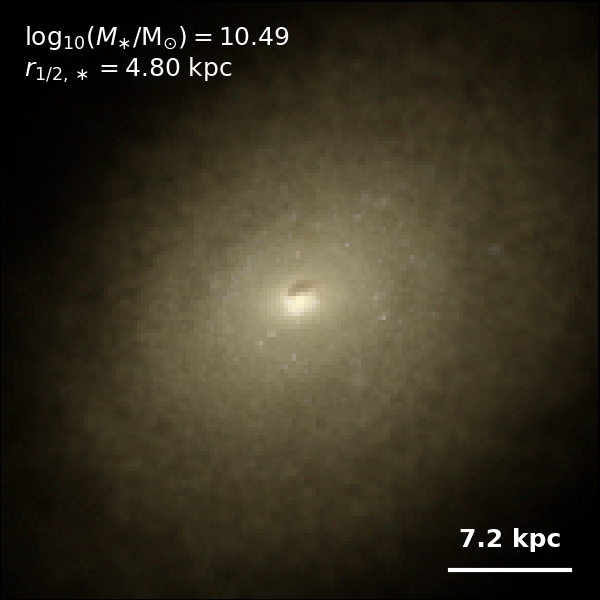 These figures are similar to Figs 3 and 4 from Rodriguez-Gomez+ (2019), but in this case we extend the analysis (originally for TNG100) to the highly detailed TNG50 simulation. Here we show idealized synthetic images (using Pan-STARRS1 g,r,i filters) of randomly selected galaxies from the TNG50 simulation, generated with the SKIRT radiative transfer code. The text labels indicate the total stellar mass and the 3D stellar half-mass radius.