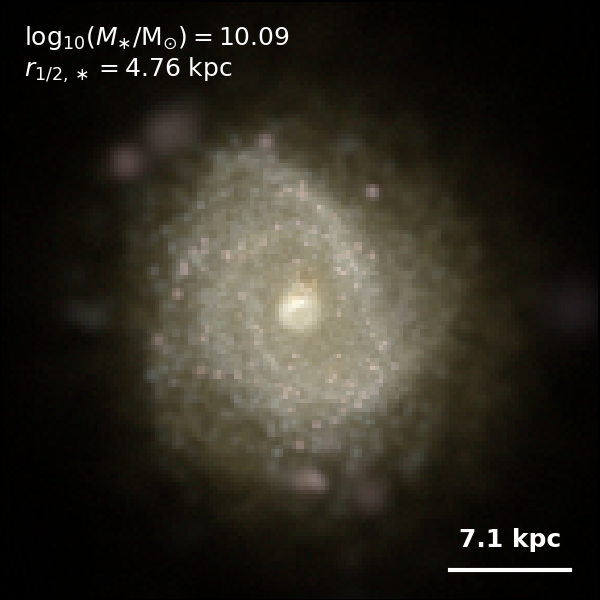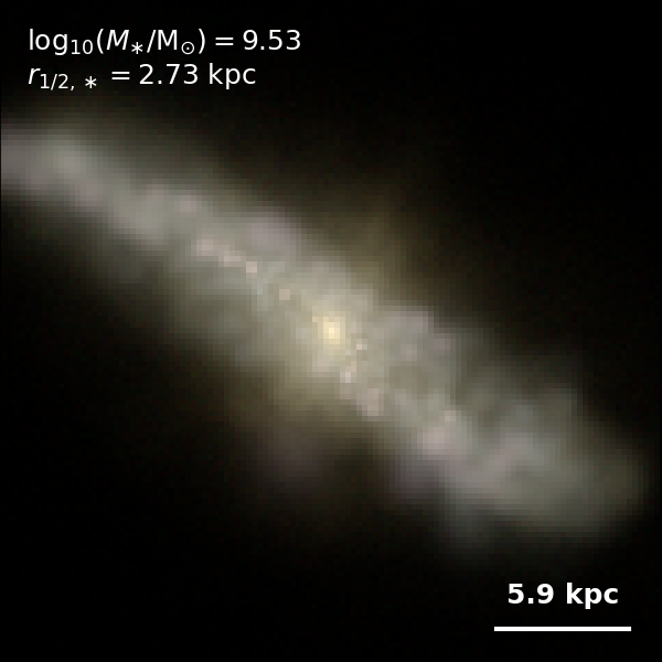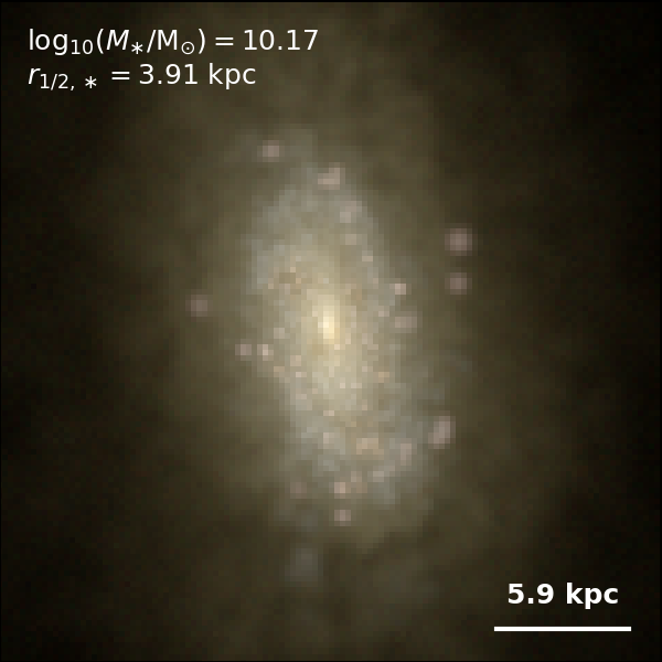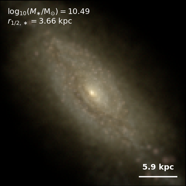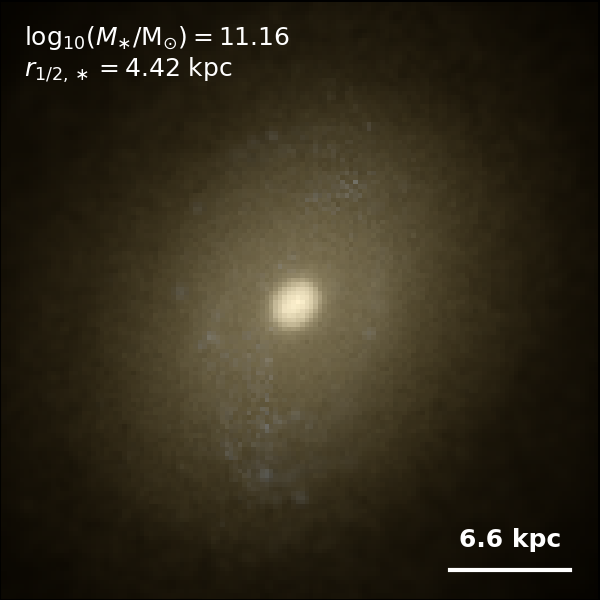 These figures are similar to Figs 3 and 4 from Rodriguez-Gomez+ (2019), but in this case we extend the analysis (originally for TNG100) to the highly detailed TNG50 simulation. Here we show idealized synthetic images (using Pan-STARRS1 g,r,i filters) of randomly selected galaxies from the TNG50 simulation, generated with the SKIRT radiative transfer code. The text labels indicate the total stellar mass and the 3D stellar half-mass radius.