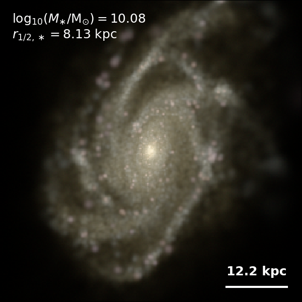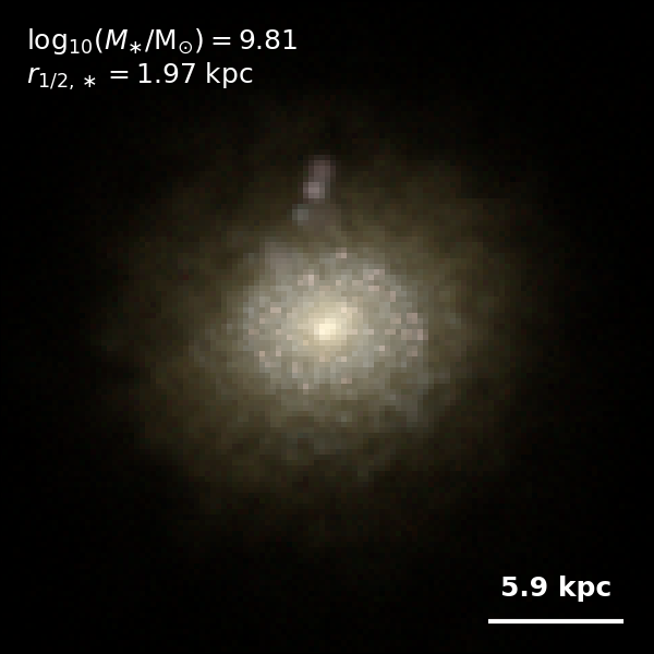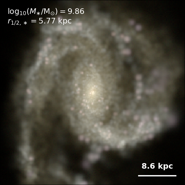 These figures are similar to Figs 3 and 4 from Rodriguez-Gomez+ (2019), but in this case we extend the analysis (originally for TNG100) to the highly detailed TNG50 simulation. Here we show idealized synthetic images (using Pan-STARRS1 g,r,i filters) of randomly selected galaxies from the TNG50 simulation, generated with the SKIRT radiative transfer code. The text labels indicate the total stellar mass and the 3D stellar half-mass radius.