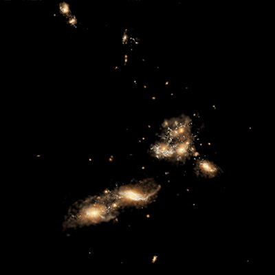The optical light from stars within a forming protocluster at redshift two in the TNG50 simulation. Here the impact of a sophisticated post-processing model for dust absorption and scattering (on the left) is contrasted against the intrinsic light that the stellar populations emit (on the right). Each of the zoom-in panels show individual galaxies marked within the larger field of view. [large]